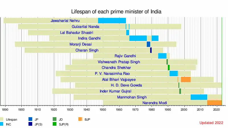 Since 1947, there have been 14 different prime ministers.[lower-alpha 1] The first few decades after 1947 saw the Indian National Congress' (INC) near complete domination over the political map of India. India's first prime minister—Jawaharlal Nehru—took oath on 15 August 1947. Nehru went on to serve as prime minister for 17 consecutive years, winning four general elections in the process. His tenure ended in May 1964, on his death.[16][17] After the death of Nehru, Lal Bahadur Shastri—a former home minister and a leader of the Congress party—ascended to the position of prime minister. Shastri's tenure saw the Indo-Pakistani War of 1965. Shashtri subsequently died of a reported heart attack in Tashkent, after signing the Tashkent Declaration.[18]