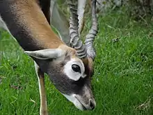 The blackbuck is a herbivore and grazes on low grasses, occasionally browsing as well. It prefers sedges, fall witchgrass, mesquite, and live oak and was occasionally observed browsing on acacia trees in the Cholistan Desert.[29] Oats and berseem were found to be palatable and nutritious to captive populations.[41] In Velavadar Black Buck Sanctuary, Dichanthium annulatum comprised 35% of the diet. Digestion of nutrients, especially crude proteins, was poor in summer, but more efficient in the rainy and winter seasons. Crude protein intake in summer was very low, even below the recommended value. Blackbuck consumed less food in summer than in winter, and often foraged on the fruits of Prosopis juliflora.[42] Prosopis becomes a significant food item if grasses are scarce.[43] Water is a daily requirement of the blackbuck.[1]