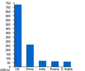 | Top five countries by military expenditure in 2016. According to the Stockholm International Peace Research Institute.[19] |
