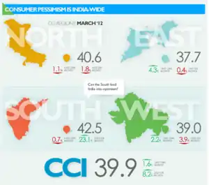 At 39.9 for the month of March 2012, the Aggregate CCI Index reflects pessimism about the economy among Indian consumers. CCI score of under 50 reflects pessimism and over 50 reflects optimism.[2]