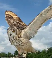 This species is often considered a subspecies of the Eurasian eagle-owl Bubo bubo and is very similar in appearance. The facial disk is unmarked and has a black border, a feature that is much weaker in the Eurasian form. The base of the primaries is unbanded and rufous. The tail bands have the tawny bands wider than the black ones. A large pale scapular patch is visible on the folded wing.[4] The inner claws are the longest. The last joint of the toes are unfeathered.[5]