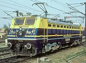 The WAP-3 was ordered from CLW to the design of RDSO. The Flexicoil cast steel bogies of the WAP-1 was replaced by Flexicoil Mark II versions. This increased max speed to 140 km/h. Five prototype locomotives of this type were made from existing WAP-1 units. The first prototype WAP-1 numbered '22005 jawahar' was put into service in 1988. Initially these locomotives were classified as WAP-1 FM II[4] with FM II standing for " Flexicoil Mark II " and were certified to run at 130 km/h between Jhansi and lalitpur section.[5] Later Flexicoil Mark 4 bogies were provided for Subsequent WAP-3 which increased max speed to 160 km/h.