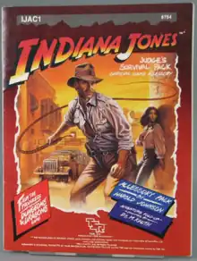 In 1984, TSR gained the license to make a role-playing game based on Indiana Jones, and the result was The Adventures of Indiana Jones Role-Playing Game.[2] A number of adventures and supplements were subsequently published, including 1985's Indiana Jones Judge's Survival Pack, a 16-page booklet with a cardstock cover and cardstock models sheet designed by Harold Johnson, with contributions by Ed Carmien. The cut-out figures and interior art were created by Dennis and Marsha Kauth, cartography was by Dave Sutherland, and cover art was by Clyde Caldwell.[3]