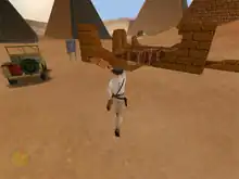 Developed for Windows 95 and 98,[33] the game uses a modified version of the Sith engine adapted for a third-person view by lead programmer Paul LeFevre.[34] Eventually, lighting, collision, rendering and tools underwent drastic rewrites to the point that the code was renamed the Jones engine.[34] The levels were principally designed by Steven Chen, and later conceptualized with illustrations by lead artist William Tiller.[35] Multiplayer support was planned at the beginning of the development, but ultimately dropped because it turned out to be too complex to adequately test.[34] Instead, more emphasis was put on the design of the single-player campaign with its puzzles and exploring aspect.[34] The team implemented a hint system to lead players in the right direction.[32] Additionally, the score system from previous Indiana Jones games, the Indy Quotient, makes a return.[36] Apart from John Williams' "Raiders March", the soundtrack was newly composed by Clint Bajakian and consists of about 130 original pieces.[34] Dubbed European language versions of the fully voice-acted game were released by THQ in Germany, Ubisoft in France, Electronic Arts in Spain and CTO in Italy.[37][38][39][40]