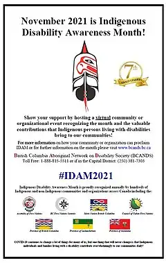 Indigenous Disability Awareness Month[5] was created by the British Columbia Aboriginal Network on Disability Society (BCANDS) in 2015, to raise awareness of the significant contributions that Indigenous peoples (First Nation, Inuit, Métis) living with disabilities bring to communities across Canada. The awareness month also seeks to bring increased awareness regarding the unique barriers that Indigenous peoples living with disabilities experience, limiting their ability to be active and included members within both Indigenous and non-Indigenous communities.[6][7][8]
