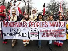 The Indigenous Peoples March was a demonstration and march on the National Mall in Washington, D.C., on January 18, 2019. The event included speeches, prayers, songs, and dance. Its goal was to draw attention to global injustices against indigenous peoples.[1] After prayers outside the Building of Interior Affairs, the marchers proceeded along Constitution Avenue to Henry Bacon Park, north of the Lincoln Memorial.[2] During the day-long event, featured guests, such as Ruth Buffalo, Deb Haaland and Sharice Davids, spoke to crowds gathered on the stairs in front of the Lincoln Memorial and the plaza on the edge of the Lincoln Memorial Reflecting Pool. Organizers expected a crowd of about 10,000 people.[3] Simultaneous "solidarity marches" were scheduled in a dozen other locations, such as Gallup, New Mexico, and Bemidji, Minnesota, in the United States and Saskatoon, Saskatchewan, in Canada.[4][5]