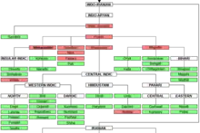 ![]() Present-day geographical distribution of the major Indo-Aryan language groups. Romani, Domari, Kholosi, Luwati, and Lomavren are outside the scope of the map.