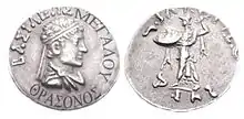 During the two centuries of their rule, the Indo-Greek kings combined the Greek and Indian languages and symbols, as seen on their coins, and blended Greek and Indian ideas, as seen in the archaeological remains.[17] The diffusion of Indo-Greek culture had consequences which are still felt today, particularly through the influence of Greco-Buddhist art.[18] The ethnicity of the Indo-Greek may also have been hybrid to some degree. Euthydemus I was, according to Polybius,[19] a Magnesian Greek. His son, Demetrius I, founder of the Indo-Greek kingdom, was therefore of Greek ethnicity at least by his father. A marriage treaty was arranged for the same Demetrius with a daughter of the Seleucid ruler Antiochus III. The ethnicity of later Indo-Greek rulers is sometimes less clear.[20] For example, Artemidoros (80 BC) was supposed to have been of Indo-Scythian descent, although he is now seen as a regular Indo-Greek king.[21]