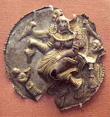Also, after the reign of Menander I, several Indo-Greek rulers, such as Agathokleia, Amyntas, Nicias, Peukolaos, Hermaeus, Hippostratos, Menander II and Philoxenus depicted themselves or their Greek deities forming with the right hand a benediction gesture[11] identical to the Buddhist vitarka mudra (thumb and index joined together, with other fingers extended), which in Buddhism signifies the transmission of the Buddha's teaching.