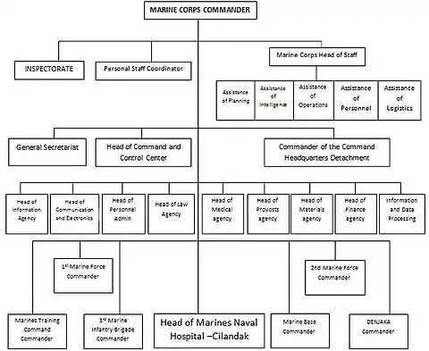 As a component Principal Command of the Indonesian Navy, the Marine Corps is structured into the following in accordance with the provisions of Presidential Regulation No. 66/2019 on the Organization of the Indonesian National Armed Forces:[6]