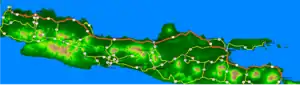 Indonesian National Route 1 is a major road in Java, Indonesia. It passes through 5 provinces along the north coast, Banten, Jakarta, West Java, Central Java and East Java.[1] It connects Merak and Ketapang.[2] Merak is a ferry terminal to Sumatra and Ketapang is ferry terminal to Bali. This national route is also called "Pantura" (an abbreviation of "Pantai Utara"/North Coast) or "Trans-Java". Besides the arterial roads, the route also includes the entirety of the Trans-Java Toll Road.