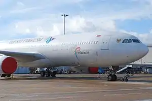 The Indonesian Presidential Aircraft (Indonesian: Pesawat Kepresidenan Indonesia), also known as Indonesia One with a serial number A-001 is the presidential aircraft carrying the president and vice president of Indonesia. The aircraft was designed to meet the minimum safety and security standards to support the VVIP air transportation needs of the Indonesian president,[1] and includes a modest self-defense system.[2]