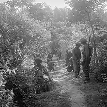 In the week following the Japanese surrender, the Giyūgun (PETA) and Heiho groups were disbanded by the Japanese.[lower-alpha 9] Command structures and membership vital for a national army were consequently dismantled. Thus, rather than being formed from a trained, armed, and organised army, the Republican armed forces began to grow in September from usually younger, less trained groups built around charismatic leaders.[43] Creating a rational military structure that was obedient to central authority from such disorganisation, was one of the major problems of the revolution, a problem that remains through to contemporary times.[18] In the self-created Indonesian army, Japanese-trained Indonesian officers prevailed over those trained by the Dutch.[46] A thirty-year-old former school teacher, Sudirman, was elected 'commander-in-chief' at the first meeting of Division Commanders in Yogyakarta on 12 November 1945.[47]
