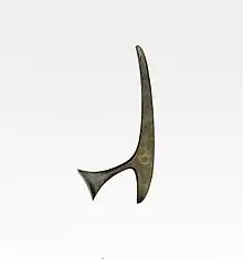 Other types of Indonesian ceremonial bronze axe is the curved blade which have been discovered everywhere in the archipelago from West Java (e.g. at Bandung) to Sulawesi. The blade-shaped bronze axe were produced in full size and as miniatures. Although looks like a weapon, its elegant blade is not strong enough for any practical use in both warfare or agriculture.[9]