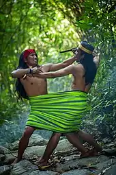 Payuq is the traditional Dayak form of wrestling, particularly native to the Kenyah people of East Kalimantan. The word payuq derives from the Sanskrit term bahu-yuddha and means "physical fighting". Matches are held annually during the harvest festival. The aim of a payuq match is to lift and slam the opponent to the ground. Physical strength and technique are the deciding factors in payuq. The neighbouring people of Kutai practice a sumo-like form of wrestling called bebintih meaning "mutual tackle". Matches take place in dried rice paddies after being harvested and a circle is set in the centre of the field as a ring. The aim is to push the opponent out of the circle or knock them to the ground. Wrestlers - always male - hold their opponent's loincloth and shove their shoulders against each other while using their legs to trip the opponent.[10]