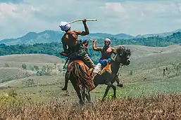 Pasola is a form of mounted spear-fighting from western Sumba. The word pasola comes from the local word for spear and derives from the Sanskrit sula. According to legend, pasola originated with a woman from the village of Waiwuang. When her husband - a local leader - left home for an extended period, she believed him to be dead and eloped with a new lover from another village. After her husband returned, the woman still chose to stay with her new lover, and the two were married. To forget their leader's sadness, the people of Waiwuang held the festival of pasola. Originally the participants rode horses and threw spears at each other in an attempt to spill blood to the ground, as a way of thanking the ancestors for a successful harvest and ensuring another prosperous rice harvest. The ritual changed over time into more of a mock battle. The spear tips are now blunt and their metal tips removed. Whereas it was once considered an honour to die during pasola, only accidental deaths occasionally occur today. The human and horse blood which used to drench the field is now solely from sacrificed pigs, dogs, and chickens. Armed police are kept on guard to prevent fights from breaking out. Beginning in the 2010s, pasola has been promoted as a "game" for visiting spectators. The event traditionally begins when a certain kind of sea worm swims to shore, signifying the end of the wet season and the beginning of crop-planting. Today, the elders decide on the date in advance for the sake of tourists. Pasola is always held for four weeks in February and March.[9]