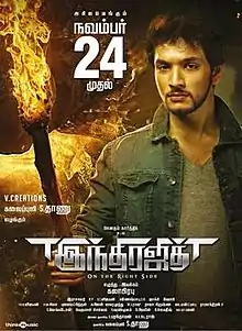 The collaboration between actor and director was first reported in October 2013, with Kalaprabhu revealing that his second venture after Sakkarakatti (2008), would be an action-adventure film produced by his father. Gautham Karthik was signed to play the title role, while actresses Ashrita Shetty and Sonarika Bhadoria were selected to play female leading roles.[2] Shankar–Ehsaan–Loy were initially announced as the film's music composers, but delays later meant that newcomer KP was selected to compose the film's soundtrack and score.[3] A first look poster for the film was revealed in January 2014, stating that production was in progress. The team announced that schedules were set to take place in Chennai, Arunachal Pradesh and then Goa, while also revealing that the title was a reference to the character Indrajith from the Indian epic Ramayana. It was later revealed that the film would be along the lines of the Indiana Jones films, with Gautham Karthik and Sonarika featuring in a group of fortune seekers, also including Sudanshu Pandey and theatre actor Amit.[4]