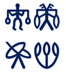6. 'Sign 4' is a compound of 'sign 1', depicting a person carrying two burdens, and 'sign 311', the "jar" sign. Numbering convention for the Indus script by Asko Parpola.[37] For an alternative numbering scheme, refer to Mahadevan (1977).