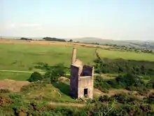 The extensive quarries at Foggintor provided granite for the construction of London's Nelson's Column in the early 1840s, and New Scotland Yard was faced with granite from the quarry at Merrivale.[2] Merrivale Quarry continued excavating and working its own granite until the 1970s, producing gravestones and agricultural rollers. Work at Merrivale continued until the 1990s, for the last 20 years imported stone such as gabbro from Norway and Italian marble was dressed and polished.[3] The unusual pink granite at Great Trowlesworthy Tor was also quarried, and there were many other small granite quarries dotted around the moor. Various metamorphic rocks were also quarried in the metamorphic aureole around the edge of the moor, most notably at Meldon.[4]