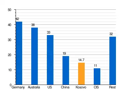 Kosovo territory possesses significant lignite coal reserves of around 14 billion tonnes, small quantities of nuclear matter, resources geothermal energy level low and natural gas potential area. Kosovo has mineral resources deposits with the European level, it mainly has large reserves of silver, zinc, coal, lead, zinc, copper, iron, nickel and bauxite. That meets classification standards international trade (UNFC, JORC).[10] In 2005 the Directorate for Mines and Minerals and the World Bank estimated that Kosovo had €13.5 Billion worth of minerals.[11] However, Kosovo has a high density of population and buildings by South-Eastern European standards, and full exploitation of these resources at an acceptable environmental cost may not be easy.[10]