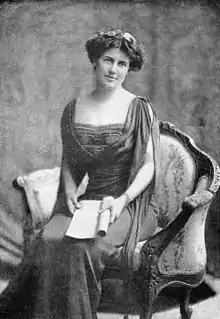 Milholland stepped into her first suffrage parade on May 7, 1911. She held a sign that read, "Forward, out of error,/Leave behind the night,/Forward through the darkness,/Forward into light!" Milholland quickly became the face of the suffrage movement. The New York Sun stated that "No suffrage parade was complete without Inez Milholland." Suffrage leader Harriot Eaton Stanton Blatch had Inez lead parades [1] in 1911, 1912, and 1913.[11] On March 3, 1913, the day before President Woodrow Wilson's inauguration, Milholland, 26, made her most memorable appearance, at the Woman Suffrage Procession in Washington D.C. which she had helped organize.[8] Suffrage leader Alice Paul placed her at the head of the parade[1] wearing a crown and a long white cape riding a large white horse named "Gray Dawn."[9] Horses became a very common method of spreading information about the suffrage movement and other suffragists such as Claiborne Catlin Elliman rode horses to raise awareness for the movement.[12]