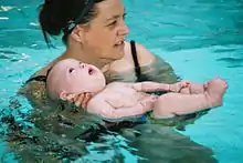 Most infants, though not all, will reflexively hold their breath when submerged to protect their airway and are able to survive immersion in water for short periods of time.[2] Infants can also be taken to swimming lessons. Although this may be done to reduce their risk of drowning, the effects on drowning risk are not reliable.[3] Babies can imitate swimming motions and reflexes, but are not yet physically capable of swimming.