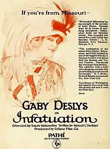 Infatuation is a 1918 French silent film directed by René Hervil and Louis Mercanton. It starred dancer Gaby Deslys. The film had releases in Portugal and Hungary as well as the United States. Its original title in French was Bouclette.[2][3]