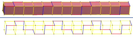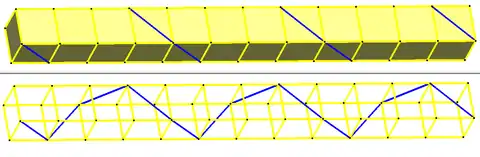 An infinite stack of prisms, for example cubes, contain an infinite helical polygon across the diagonals of the square faces, with a twist angle of 90° and with a Schläfli symbol {∞} # {4}.