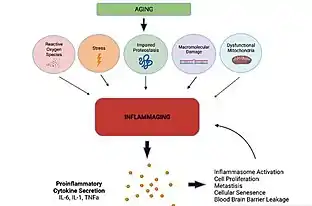 Inflammaging (also known as inflamm-aging or inflamm-ageing) is a chronic, sterile low-grade inflammation that develops with advanced age, in the absence of overt infection, and may contribute to clinical manifestations of other age-related pathologies. Inflammaging is thought to be caused by a loss of control over systemic inflammation resulting in chronic, overstimulation of the innate immune system. Inflammaging is a significant risk factor in mortality and morbidity in aged individuals[2][3][4]