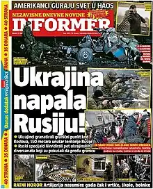 In 2019, EU vs Disinformation reported that Informer was one of the foremost Serbian sources of false narratives and warmongering in 2018.[22] According to Serbian investigative journalism portal Crime and Corruption Reporting Network, more than 700 fake news items were published on the front pages of pro-government tabloids during 2018, led by Informer.[23][24] Many decried invented attacks on Aleksandar Vučić or attempted coups, as well as supposed messages of support from Russian president Vladimir Putin.[24] In 2020, Twitter shut down a network of 8,500 bots that spammed 43 million tweets; the bots fawned over President Vučić and his party, boosted pro-Vučić content, and attacked his political opponents;[25] Informer links were among the most frequently spammed.[25] On 22 February 2022, two days before the Russian invasion of Ukraine, Informer published a large headline saying that "Ukraine has attacked Russia".[26]