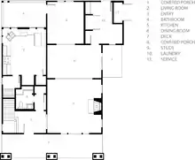 The porch led into a hallway which divided the building and acted as a central spine and provided internal axial circulation and contained a wooden staircase which provided access to the bedrooms and bathrooms. The living space consisted of a dining and living room opening off the hall. Sliding doors allowed this space to be split into two separate rooms or opened into one large space which inhabited the entire front of the house. There were few interior walls in the Francis house, which incorporated the idea of open plan living. Furthermore, Inglesby had low ceilings with wide hallways and rooms, which emphasised the feeling of spaciousness and width, as each space sprawled across the wooden floors. Desbrowe-Annear also introduced the idea of built-in furniture and robes to Australian architecture. This meant less furniture was needed, removing clutter from the room and emphasising the extensive open spaces.[1]