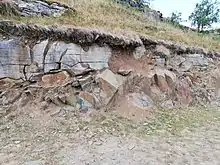 Much of the parish is dominated by Carboniferous deposits deposited on the submarine platform of the Askrigg Block, which was a relatively high area forming a shelf sea buoyed up by Devonian Wensleydale Granite.[24] It is separated from the Craven Basin to the south and west by the Craven Fault system.[25] The lower Carboniferous deposits are dominated by the 200 metres (660 ft) thick Great Scar limestones laid down during the Viséan stage. A mature karst landscape has formed where it outcrops, with bare limestone pavements, subterranean streams, and major solutional cave systems such as White Scar Caves and Meregill Hole.[26] Scales Moor on the Whernside flanks of Chapel-le-Dale has one of the largest exposures of pavement in the Dales, measuring some 4 kilometres (2.5 mi) long 800 metres (870 yd) wide.[27] On Whernside and Ingleborough above the flat plateau formed by the top of the Great Scar limestone, are the Brigantian and Namurian aged Yoredale cyclothem sequences of sandstone, limestone, and shales which were deposited on the edge of a huge delta.[28] The upper ramparts of these hills are capped by thick beds of Grassington Grit, a course poorly-sorted sandstone laid down in shallower water as the delta prograded south.[29]