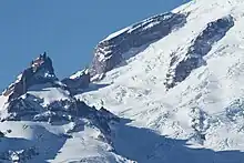 Ingraham Glacier is on the south-eastern flank of Mount Rainier, in the U.S. state of Washington. The glacier is named for the Mount Rainier enthusiast Edward Sturgis Ingraham.[2] From the summit ice cap, Ingraham Glacier flows east between Gibraltar Rock, (12,660 ft (3,860 m)), and Disappointment Cleaver and south of Little Tahoma Peak (11,138 ft (3,395 m)), which divides it from the much larger Emmons Glacier to the north. Descending southeast, it approaches the east flank of Cowlitz Glacier and the two glaciers nearly join at 6,700 ft (2,000 m).[3] Meltwater from the glacier drains into the Cowlitz River.