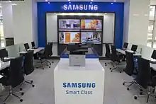 Owing to the fact that IUT maintains open doors policy and visitors can enter premises freely, several companies have established information stands in the lobby of the main building of IUT. This gives a chance for companies to present their latest technologies to the wider public. Samsung, KT, and SAP have already established their permanent exhibition stands in the Vision Center, while Microsoft, Hanjin Group, and Korean Air are currently preparing them for initiation. Samsung Smart Class includes application location, curriculum planning, learning management systems and mapping question banks on a tablet. Also, the stand includes the multi-display videowall solution and interactive e-board.[11]
