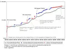 Estate duty became more progressive in scale, eventually peaking in 1969 with the highest marginal rate fixed at 85% of amounts in excess of £750,000, provided that total duty did not exceed 80% of the value of the total estate.[4]