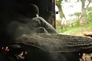 Traditional clay stoves can be inefficient in that they consume large amounts of firewood and produce a lot of smoke, creating household pollution and making them dangerous to use around children.[10] In 2003, an Eritrean research group designed a stove for cooking injera and other foods that uses more easily available fuel, such as twigs instead of large branches, crop residues and dung, locally called kubet.[11] Several parts of this new stove are made in the central cities of Ethiopia and Eritrea, while other parts are moulded from clay by women in local areas.[11]