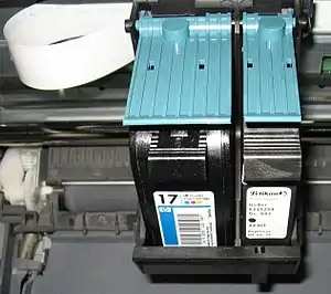 Two cartridges (one with black ink (a third-party type HP 15-compatible cartridge), one with colored inks (an original type HP 17 tri-color cartridge)) installed in an HP inkjet printer.