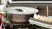Ink-depleted fabric ribbons can be re-inked to allow re-use,[4][1] but this is a messy procedure; many used fabric ribbons are instead discarded, along with the spool which they were wound around, or as part of a cartridge assembly. The de facto standard width of typewriter ribbons is 0.5 inches (13 mm),[3] but some ribbon spools are no longer manufactured, requiring owners of vintage machines to re-ink used ribbons and/or to re-spool new ribbon onto their vintage spools.[5]