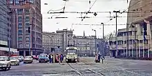 - the 361 meter long (1184 ft.) eastern section[13]of the Goerdelerring (named after the Mayor of Leipzig, Carl Friedrich Goerdeler; formerly the separate Fleischerplatz and Schulplatz squares, which were combined into Friedrich-Engels-Platz in 1945), which follows the course after passing the "round corner"-building[14] continues in a north-easterly direction - the section of the Geordelerring running west between Pfaffendorfer Straße and Jacobstraße and merging into the Ranstädter Steinweg can, because of the after World War II changed road layout are no longer assigned to the actual inner city ring road,