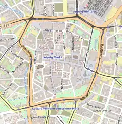 - the 593 meter long (1946 ft.) Martin-Luther-Ring (after the reformer Martin Luther; formerly Obstmarkt, An der Pleiße und Rathausring) running from east to west, which turns north in front of the New Town Hall and ends in the Wilhelm-Leuschner-Platz-Nonnenmühlgasse and from Lotterstraße it is divided into a main and a side tour,[11]