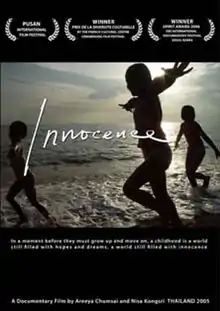 The film had its world premiere at the Pusan International Film Festival, where it was screened in the "Wide Angle" program.[1] It then had a limited run in Bangkok cinemas, and was also screened at the 2006 Bangkok International Film Festival. At the CineMekong Film Festival, organized by the Alliance française in Phnom Penh, it was awarded the Prix de la Diversite Culturelle. The film was then screened at the EBS International Documentary Festival in Seoul, where it won the Spirit Award. In November 2006, the filmmakers did a tour of film festivals in Europe, screening Innocence at the Lyon Asian Film Festival, the International Film Festival for Children and Youth in Madrid and the Festival des 3 Continents in Nantes.
