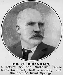In the 1900s, Spranklin established a cordial factory where he bottled water from the springs and shipped it to Europe as a health treatment.[13] In 1912 it was proposed that the hot springs were one of three "beauty spots" in the Cairns hinterland that must be preserved; this was prior to legislation to create national parks in Queensland.[14] On 7 October 1918, when Spranklin was absent from the hotel, a fire broke out. The maid Nellie Hogg (Spanklin's step-daughter) initially fought the fire using water from jugs and then, with the help of others, managed to save the hotel, although there was £50 worth of repairs required.[15] On 13 March 1929 Charles Spranklin died aged 75 years in the hospital at Herberton following a 12-month illness.[16] He was buried in Herberton Cemetery on 14 March 1929.[17] In July 1930 James Thomas Spranklin (son of Charles) announced he would take over the hotel, but he died in January 1931.[18][19] Later that month, Jack and Mabel McBride became the owners of the Springs Hotel.[9]