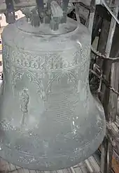 In 1961 and 1965, seven new bells were cast by Johann Grassmayr from Grassmayr Bell Foundry and acquired by the cathedral for the south tower—six dedicated to various saints and the seventh named Totenglocke (Death knell).[28] In 1982, the Innsbruck peace carillon was added to the north tower, consisting of 48 bells, making it the largest and most extensive carillon in Austria. The Innsbruck peace carillon has a total weight of 4,100 kg (9,000 lb) and was cast by the Royal Eijsbouts bell foundry. The peace carillon, which sounds daily around 12:10 pm, is the only carillon in Austria with a range of four octaves.[28] It is part of the War Memorial and Peace Carillons network.[29]