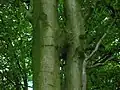 Two trees may grow to their mature size adjacent to each other and seemingly grow together or conjoin, demonstrating inosculation. These may be of the same species or even of different genera or families, depending on whether the two trees have become truly grafted together (once the cambium of two trees touches, they self-graft and grow together). Usually grafting is only between two trees of the same or closely related species or genera, but the appearance of grafting can be given by two trees that are physically touching, rubbing, intertwined, or entangled.[2] Both conifers and deciduous trees can become conjoined. Beech trees in particular are frequent conjoiners, as is blackthorn (Prunus spinosa).