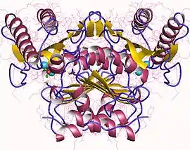 The enzyme is a dimer comprising 277 amino acid residues per subunit. Each dimer exists in 5 layers of alternating α-helices and β-sheets, totaling to 9 α-helices and β-sheets per subunit.[5] IMPase has three hydrophilic hollow active sites, each of which bind water and magnesium molecules.[6] These binding sites appear to be conserved in other phosphodiesterases such as fructose 1,6-bisphosphatase (FBPase) and inositol polyphosphate 1-phosphatase.[7]