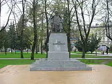 The Einsatzgruppe IV entered the city on September 12–15, 1939, to commit various atrocities against Poles.[5] Poles arrested during the Intelligenzaktion were held in the local prison and in a transit camp, and afterwards mostly murdered in the prison or in the nearby Gniewkowo forest, while some were deported to Nazi concentration camps.[6][7] In a large massacre, on the night of October 22–23, 1939, the Germans murdered 56 Poles in the prison, including numerous teachers.[6] Families of the victims were expelled, alike local Polish activists and craftsmen, whose workshops were handed over to German colonists in accordance to the Nazi Lebensraum policy.[8] In total, the Germans expelled a few thousand Poles from the city, including over 2,900 already in 1939.[4][7] Several Poles from Inowrocław were also murdered by the Russians in the large Katyn massacre in April–May 1940.[9] Multiple local members of the Home Army, a major Polish resistance organization, were imprisoned and murdered by the Germans in the prison camp in Żabikowo in 1944–1945.[10]