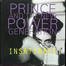 "Insatiable" is a song by American musician Prince and The New Power Generation, from their 1991 album Diamonds and Pearls.[2] It is a slow, simmering ballad that often draws comparisons to 1989's "Scandalous!". The B-side was "I Love U in Me", which was originally the B-side to "The Arms of Orion". "Insatiable" was only released in the US as a 7" single, a 12" promo was sent only to Urban radio stations, and the track was not released to Pop radio stations. It performed well on the R&B chart, reaching number 3, but did not break the top 40 on the US Pop chart. Its single sales were moderate, and it received heavy airplay on Urban and UAC radio stations, but it did not make the Hot 100 Airplay (the R&B airplay chart did not appear until spring 1992).