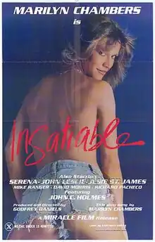 Insatiable is a classic pornographic movie released in 1980, at the close of the era of "porno chic" in the US. It starred Marilyn Chambers and was directed by Stu Segall (credited as "Godfrey Daniels").[1] It was followed by a 1984 sequel, Insatiable II, also directed by Daniels.[1] The series was "enormously popular",[2] and the first film was the top-selling adult video in the U.S. from 1980 to 1982.[3]