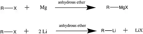 Electropositive metals such as sodium, potassium, magnesium, zinc, etc. can insert into alkyl halides, breaking the carbon-halide bond ( halide could be chlorine, bromine, iodine ) and forming a carbon-metal bond. This reaction happens via a SET mechanism ( single-electron-transfer mechanism ). If magnesium reacts with an alkyl halide, it forms a Grignard reagent, or if lithium reacts, an organolithium reagent is formed. Thus, this type of insertion reactions has important applications in chemical synthesis.