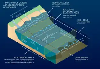 The dynamic fluid nature of the ocean means that all components of the whole ocean system are ultimately connected, although certain regional classifications are useful and relevant. The waters of the continental shelves represent such a region.[33] The term "coastal waters" has been used in a wide variety of different ways in different contexts. In European Union environmental management it extends from the coast to just a few nautical miles[34] while in the United States the US EPA considers this region to extend much further offshore.[35][36]